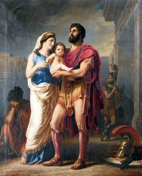 Et Talthybos arracha l'enfant des bras de sa mère pour le remettre à Néoptolème. Plus tard il rapportera le corps brisé à Hécube dans le bouclier de son père, Hector.