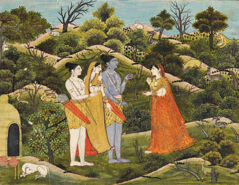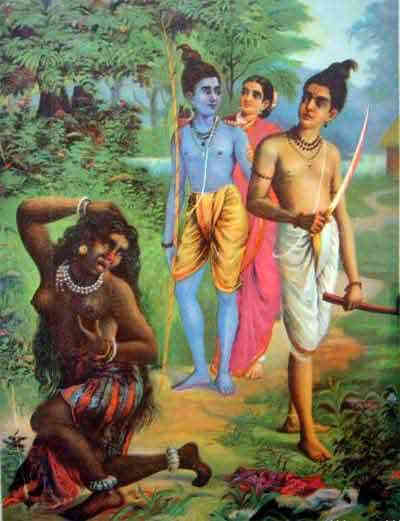 Rama ne fut pas dupe et vit le jeu de Shurpanakha, il rejeta gentiment ses avances, en lui disant qu'il était fidèle à sa femme. Pour faire une petite blague à son frère, il lui dit que Lakshmana était encore célibataire.