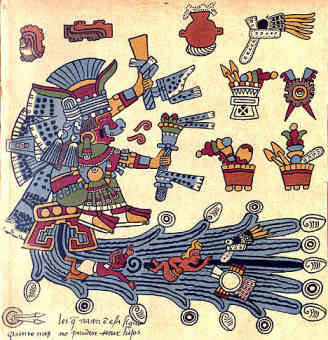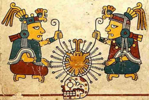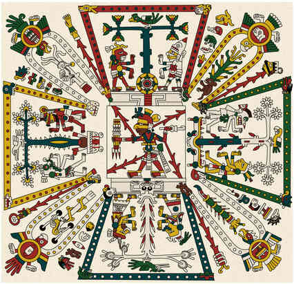 Avant le soleil qui brille sur nos journées, quatre autres soleils avaient été créés puis détruits entrainant avec eux la disparition des habitants et un bouleversement de la Terre. Le canevas était toujours le même: une divinité créait un nouveau soleil qui était détruit par un dieu jaloux. Chaque période était reliée à l'un des éléments terre, vent, feu, eau. L'univers passe par une série d'ères successives, caractérisées chacune par un soleil spécifique, un peuple particulier, un type de nourriture et se termine toujours par un cataclysme différent. (fig.1 Codex Fejérváry-Mayer)