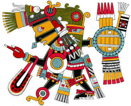 • Teztlipoca bleu au Sud, nommé Huitzilopochtli, le dieu de la guerre. (il existe une autre version de sa naissance avec comme mère Coatlicue)