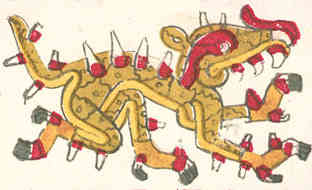 Cipactli s'est mis à pleurer à chaudes larmes alors les autres dieux émus transformèrent chaque partie de son corps en un élément de la nature. Ainsi ses poils devinrent des arbres, les fleurs et les herbes, de sa peau l'herbe menue et les petites fleurs, de ses yeux des fontaines, des puits et les petites grottes, de ses bouches les rivières et les grandes grottes, de son nez et de ses épaules les vallées et les montagnes. (fig. 3 Cipactli, Codex Borgia)