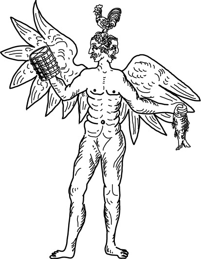 il est austère et implacable. Il a une barbe, des ailes et deux visages. Il est généralement décrit comme ayant un poisson dans la main gauche, un ustensile dans la main droite et un coq sur la tête.