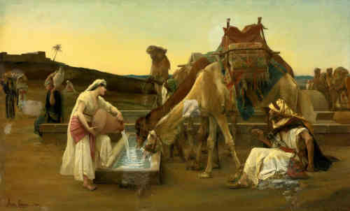 A dix chameaux chargés de riches présents, Éliézér se mit en route et arriva bientôt à Harran. Il installa son campement près d'un point d'eau aux portes de la ville. Là, il pourrait voir, le soir venu, les femmes venir chercher de l'eau au puits. Mais pour identifier la femme qui pourrait convenir à son maitre et à Isaac, Éliézér demanda à l'Eternel un indice. Il devait choisir la femme qui lui donnerait un peu d'eau, et qui abreuverait aussi ses chameaux.