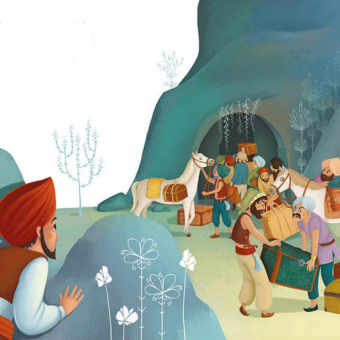Ali Baba est un très pauvre bûcheron. Un jour, alors qu'Ali coupe du bois, il entend des voix. Il se cache sur un arbre, d'où il entend le chef d'une bande de 40 voleurs prononcer la formule magique qui permet l'ouverture du rocher qui obstrue l'entrée d'une grotte, la rendant ainsi invisible de l'extérieur : « Sésame ouvre-toi!", et la formule magique pour la fermer : « Sésame ferme-toi! ».