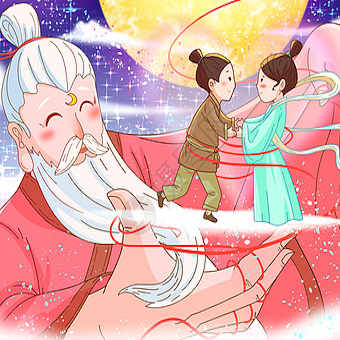 Wei Gu, un tout jeune voyageur était descendu dans une auberge de Songcheng. Près de l’entrée, sous la clarté lunaire, il vit un vieil homme appuyé contre un sac de toile qui semblait consulter un registre. Intrigué il s’approcha : les pages du registre étaient blanches. Il ne put s’empêcher de lui demander ce qu’il pouvait bien y chercher. Le vieillard lui répondit : « Tous les mariages du monde sont inscrits dans ce registre. Dans ce sac il y a des fils de soie rouge qui, une fois attachés aux pieds de deux personnes, les vouent à être époux, quelle que soit la distance sociale ou géographique qui les sépare actuellement, même si leurs familles sont ennemies jurées. » La curiosité l’emportant sur la raison, Wei Gu ne put s’empêcher de lui demander s’il savait qui il épouserait. Bien sûr répondit le vieil homme en riant : « Contre le mur nord de l’auberge, il y a l’étal d’une vieille marchande de légumes. Ta future épouse, c’est sa petite-fille. »[ Le lendemain, par curiosité, il alla jeter un coup d’œil et vit effectivement, courant autour de l’étal, une petite fille pas très bien mise et tout à fait qulconque. Vexé, il la poussa alors qu’elle passait près de lui. L’enfant tomba et se mit à pleurer à grand bruit ; Wei Gu s’éclipsa mi-honteux mi-rageur.] Quelques années passèrent. S’étant distingué lors d’une campagne militaire, Wei Gu se trouva fiancé à la fille du chef de l’arsenal de Xiangzhou7. [ Le soir des noces, découvrant selon la coutume le visage de sa femme pour la première fois, il fut intrigué par une cicatrice qu’elle portait entre les sourcils. Elle lui expliqua : « Lorsque j’étais petite, un jour que je tenais compagnie à ma grand-mère, un voyou m’a fait tomber sur le front et j’en ai gardé une cicatrice. »] Wei Gu dut alors se rendre à l’évidence : sa femme était bien la petite fille annoncée et le vieillard était bien un dieu. Il confessa son histoire, qui finit par parvenir aux oreilles du préfet de Songcheng. Celui-ci fit renommer « Auberge des fiançailles » et l’existence du vieillard sous la lune fut bientôt connue de tous. Quant à Wei Gu et sa femme, ayant pris conscience que leur union n’était pas le fruit du hasard, ils eurent à cœur de ne jamais se disputer. parfois que, si certains couples ne s'entendent pas bien, c'est parce que le vieillard, qui ne dispose que d'un local limité pour faire sécher les effigies en terre qu'il fabrique, doit en laisser dehors. Il arrive que la pluie les fasse fondre partiellement diminuant de ce fait l'harmonie de leur union.