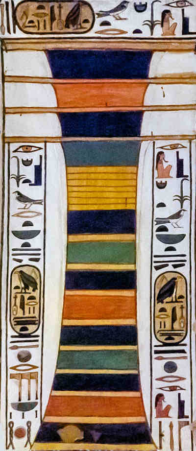 Juste avant de pénétrer dans la chambre funéraire, Isis, les ailes déployées, accueille la reine. Le ciel est peint en bleu foncé constellé d'étoiles jaunes.