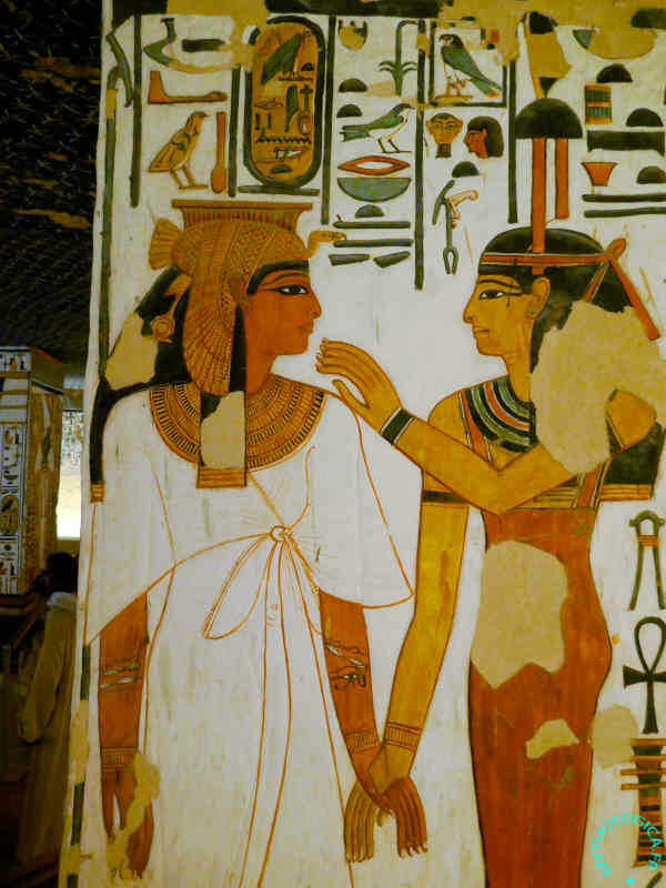 Sur un pilier (III) on peut voir un tatouage sur les avant-bras de Néfertari que les gardiens s'empressent de vous montrer. Mais il semble que cela soit, dans cette tombe, la seule figuration de tatouages qui représentent des bracelets et un oeil oudjat.