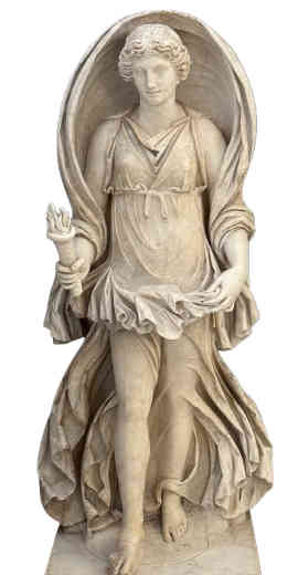 Les artistes du IV ième siècle, surtout Scopas et Praxitèle, apportent des types nouveaux, qui seront copiés ou imités jusqu' à la fin de la période gréco-romaine. C'est l'Artémis chasseresse: tantôt en marche, chaussée de sandales, en tunique courte serrée à la taille, carquois sur le dos, les cheveux relevés par un bandeau, et suivie d'un chien ou d'une biche; tantôt au repos, jouant avec son chien, ou achevant sa toilette après la chasse, et agrafant sa chlamyde.