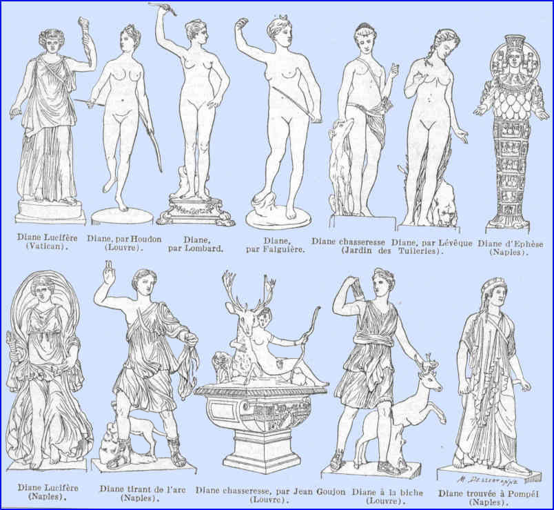 En sculpture, les représentations romaines de Diane (Diane de Versailles, ou de Léocharès au Louvre) dérivent généralement de l'iconographie hellénistique d'Artémis. Ce thème inspira des sculpteurs comme Goujon, Coysevox ou Houdon.