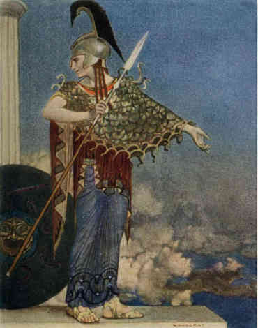 Et, au milieu d'eux, Athéna aux yeux clairs portait l'Egide glorieuse, impérissable et immortelle. Et cent franges d'or bien tissées, chacune du prix de cent boeufs, y étaient suspendues.