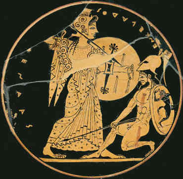 Non contente de stimuler l'ardeur des Grecs, qu'elle favorise, Athéna s'engagea elle-même dans la mêlée. Elle mit alors sur sa tête son casque d'or, à cimier doublement saillant, « assez vaste pour coiffer les fantassins de cent villes », jeta sur ses épaules l'égide, elle saisit elle-même les rênes du char de Diomède, et se lança contre Arès, qu'elle terrassa d'un coup de lance.