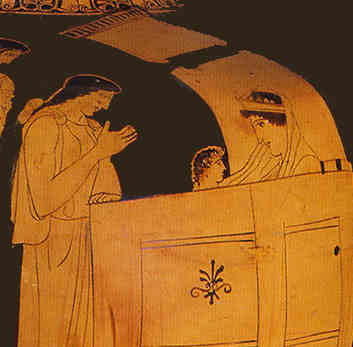 Lorsque Acrisios apprit la chose, il ne voulut pas croire que Zeus fût le père et soupçonna son frère Proétos d'avoir eut des rapports secrets avec elle; mais, comme il n'osait pas tuer sa propre fille de peur du courroux des dieux et des Erinyes, il l'enferma, elle et le petit Persée, dans un coffre de bois richement orné qu'il lança à la mer.