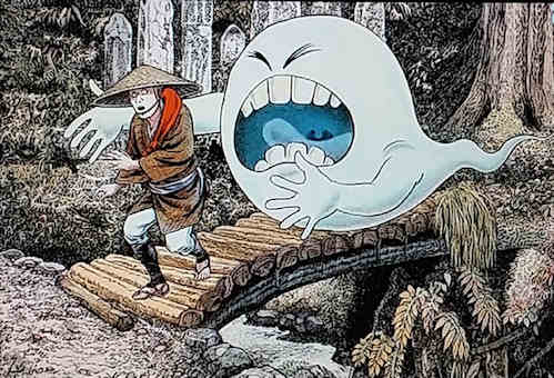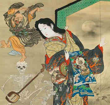 Peu à peu une relation s'établit par un échange de poèmes et Ikkyu fut impressionné par sa sagesse et son intelligence. A sa mort elle laissa un poème : "ne pas m'incinérer, ni m'enterrer, mais laissez mon corps dans les champs pour nourrir les chiens affamés". - JIKININKI : Fantôme qui se nourrit exclusivement de cadavres humains. C'est le résultat de la conduite cannibale au cours de leur vie terrestre. Une faim continuelle le pousse constamment à agir ainsi même s'il n’éprouve aucun plaisir. Coincé entre le monde des morts et celui des vivants, il se manifestent pendant la nuit et évite la compagnie des hommes, toutefois afin de manger des cadavres récents il reste également à proximité des villes et des villages.