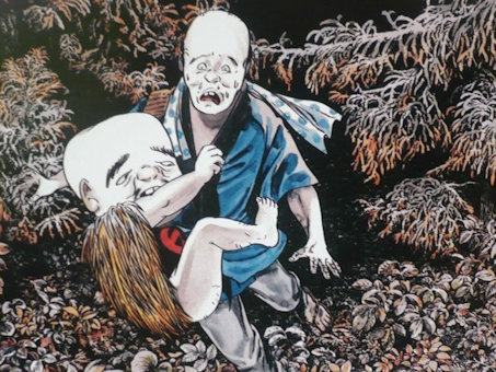 Légende : Il y a bien longtemps, un couple aisé donna naissance à une fille atteinte d'une étrange maladie. Même à cinq ans, elle n'avait jamais prononcé un mot. Très affligés par ce qui s'était passé, ils cherchèrent un médecin ou un prêtre pour les aider. Jusqu'à ce qu'un chaman leur propose une solution terrifiante : le seul moyen de la faire parler à nouveau était de trouver le « foie frais » du fœtus dans le ventre de sa mère et de le lui donner à manger. Leur nourrice fut chargée de cette tâche, et il sembla qu'il faudrait beaucoup de temps pour trouver quelqu'un qui accepterait de lui donner le foie frais du fœtus. La nourrice donna donc une amulette à sa fille et partit à sa recherche, promettant de ne pas revenir si elle ne trouvait pas ce dont elle avait besoin.Kurozuka