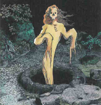 - KYŌKOTSU : Yōkai squelettique terrifiant qui surgit d'un puits pour terroriser ceux qui passent à proximité. Il apparaît comme un squelette enveloppé dans un tissu déchiré, les cheveux ébouriffés et emmêlés. Ces squelettes peuvent appartenir à des personnes qui se sont suicidées, ont été assassinées ou sont tombées accidentellement dans le puits et y sont mortes. Sans rites funéraires appropriés, les squelettes éprouvent un profond ressentiment et surgissent pour maudire quiconque perturbe leur sommeil dans le puits. Parfois, le simple fait de venir puiser de l'eau au puits est considéré comme un trouble impardonnable.