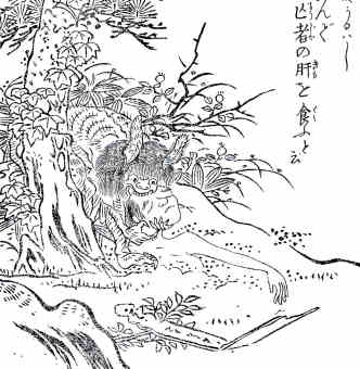 - MŌRYŌ ou MIZUHA : Terme collectif pour désigner les esprits des montagnes, des rivières, des arbres et des roches. Ils ont la taille d'un enfant de trois ans. Ils sont de couleur noir rougeâtre, avec des yeux rouges, de longues oreilles et une chevelure fournie. Ils vivent près des cimetières car ils se nourrissent des entrailles des cadavres et de préférence du foie. Ils craignent les chênes et les tigres c'est pourquoi dans la Chine dont ils sont originaires, il était courant de planter ces arbres dans les cimetières et d'orner les rues de statues de tigres.