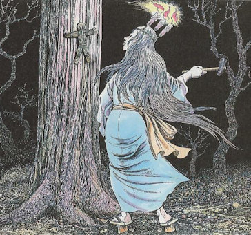 - USHI-NO-TOKI MAIRI : Désigne une méthode traditionnelle prescrite pour jeter une malédiction sur une personne, ainsi nommée car elle se déroule pendant les heures du Bœuf (entre 1 et 3 heures du matin). La pratiquante – généralement une femme méprisée, vêtue de blanc et couronnée d'un anneau de fer orné de trois bougies allumées, enfonce des clous dans un arbre sacré (shinboku) d'un sanctuaire shintoïste. A l'époque moderne, les clous sont enfoncés dans une effigie de paille de la victime, puis clouée sur l'arbre. Le rituel doit être répété sept jours de suite, pour censet réussir, toutefois s'il y a un témoin de l'acte ceci annuler la malédiction. Le sanctuaire Kifune de Kyoto est célèbre pour son association avec ce rituel.
