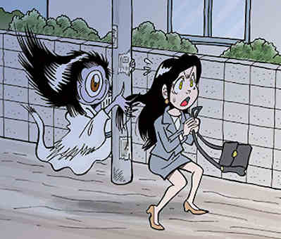 - USHIROGAMI : Yōkai féminin borgne et sans pieds qui se faufile derrière les femmes seules pour leur tirer les cheveux. Il aime toucher les victimes avec leurs mains glacées ou leur souffle chaud. Il est capable de modifier le climat pour renverser les parapluies par une rafale de vent.