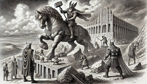 Comme aucun d'entre eux ne savait en construire ils acceptèrent la proposition d'un maître bâtisseur, Hrimthurs, qui leur proposa de construire la plus grande et la plus puissante de toutes les forteresses. Mais en échange, il demandait seulement le soleil, la lune et la belle Freyja !
