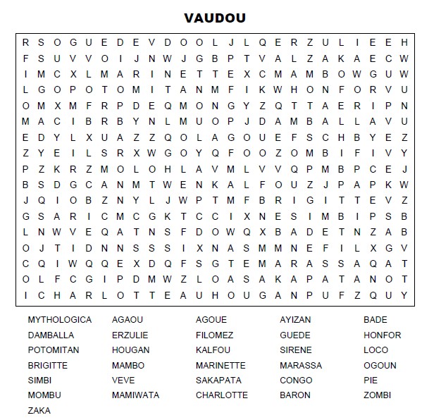 Les 31 mots à chercher peuvent être disposés horizontalement, verticalement, en diagonale voire écrits à l'envers. Une même lettre peut servir à plusieurs mots en rapport avec le vaudou.
