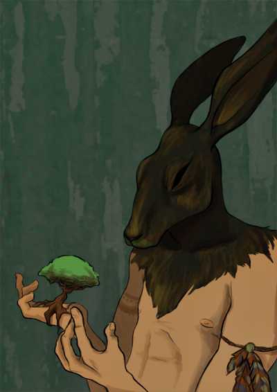 Michabo (ou Manibozho) est le gigantesque lièvre de la tribu des algonquins; il est le fils de Kabun, le vent d'Ouest.