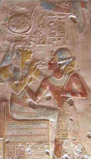 Iousâas sous sa forme habituelle qui tend à pharaon le signe "ankh" flanqué de deux spectres "ouas" est visible sur le mur Ouest du second hypostyle à Abydos