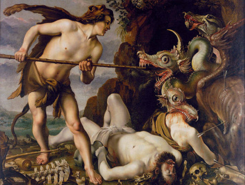 par un redoutable dragon, progéniture d'Arès. Le combat fut rude mais Cadmos réussit à tuer le dragon.