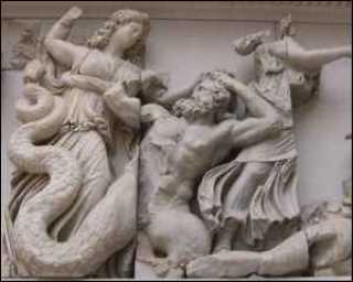 Pour que les coups portés par les Olympiens soient mortels, Zeus se mit en quête de l'herbe miraculeuse; il obligea Eos à ne pas sortir; Hélios et Séléné ne devaient pas briller ainsi dans l'obscurité totale il cueillit tous les plants.