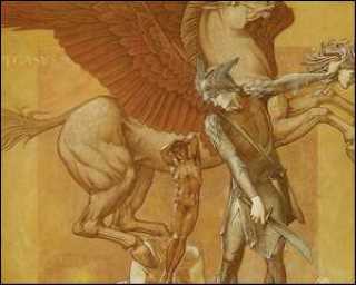 ① Persée s'était imprudemment lancé dans la quête de la tête de Méduse qu'il avait promis de rapporter à Polydectès. Heureusement pour lui, Athéna toujours secourable envers les héros, et d'autres divinités lui avaient fourni les indications indispensables pour la trouver et lui avaient indiqué la manière de lui couper la tête sans risquer de se faire pétrifier. Lorsqu'il lui trancha la tête en regardant dans son bouclier, il fut étonné de voir surgir un cheval ailé du corps décapité de Méduse. Pégase servit d'abord de monture à ce héros pour s'échapper puis à délivrer Andromède exposée sur un rocher battu par la mer à un monstre marin venu la dévorer.